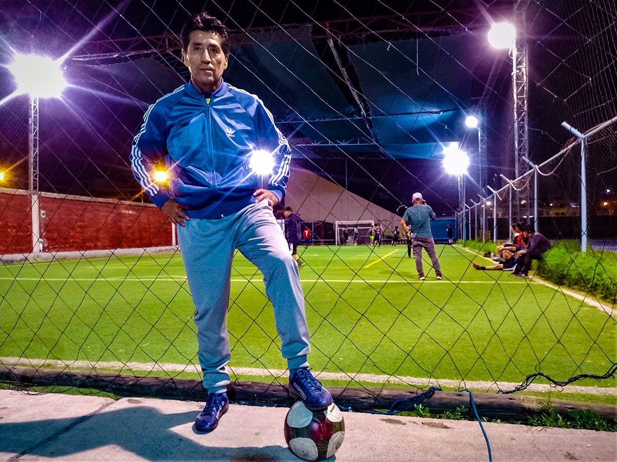 Carlos Paredes Pachari (62), usa ropa holgada y casi siempre deportiva; zapatillas, buzo, polo y casaca, lo más cómodo y funcional. Parece un engalanado de los noventa, un hombre feliz. Lo cierto es que utiliza el típico atuendo de un entrenador de fútbol.