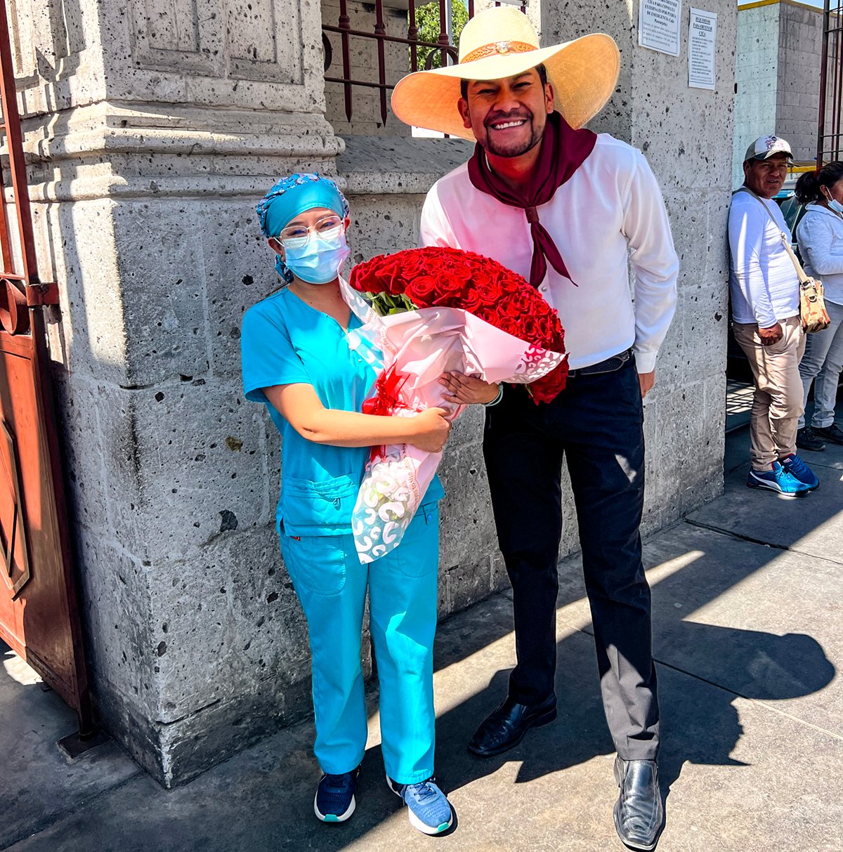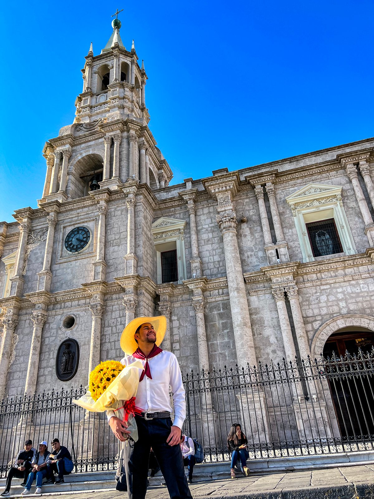 José se acerca bailando como los danzarines del montonero arequipeño, abrazando un ramo de rosas, vestido con camisa blanca, pantalón negro de tela, pañoleta carmesí, el color de la bandera de Arequipa, amarrada al cuello y el sombrero de ala ancha.