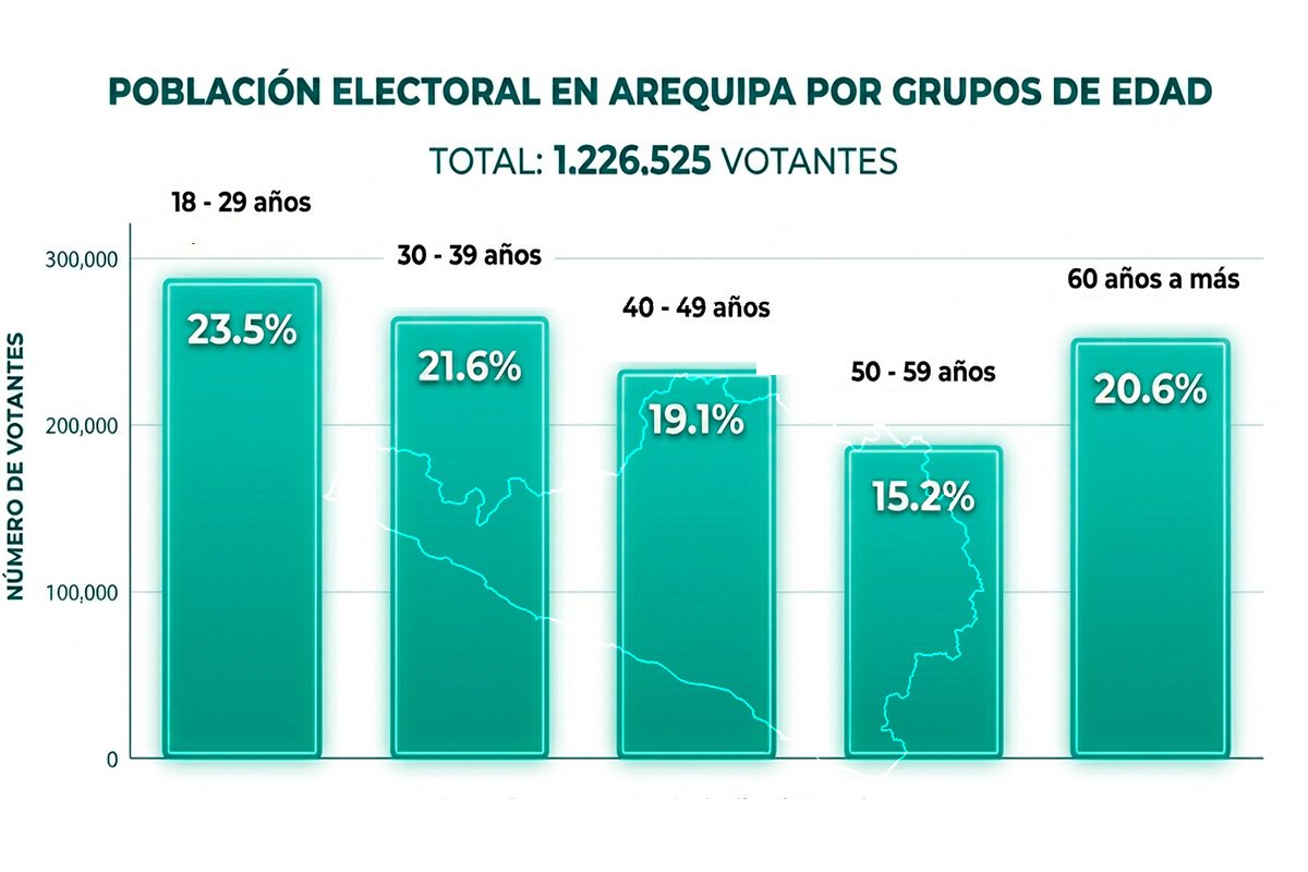 En la región Arequipa, 1 226 525 ciudadanos están habilitados para votar. La distribución por género es equilibrada: 614 108 mujeres y 612 417 hombres.