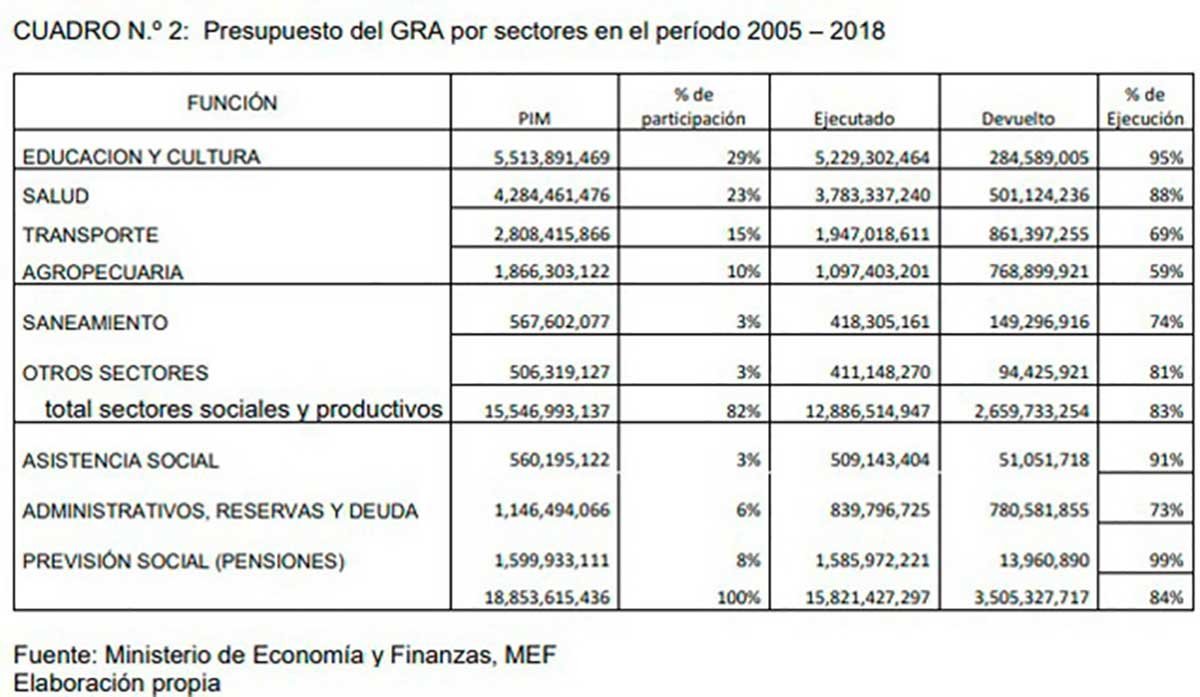 En cuanto a ejecución de inversiones, la mejor fue en 2005, con 80% y la peor en el año 2018, con 58%. En los 16 años de estudio, el GRA recibió un presupuesto de S/ 18 954 millones, de los cuales asignó 82% a los sectores sociales y productivos. En estos sectores no se utilizaron S/ 2 660 millones (ver cuadro 2).
