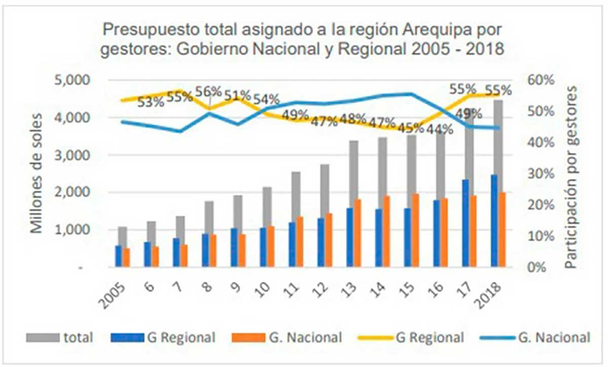 En 2002 (cuando se instaló el primer gobierno regional) Arequipa recibió un presupuesto cercano a los S/ 855 millones. En el año 2018 (año final del estudio), alcanzó los S/ 4 475 millones, es decir, fue cinco veces mayor. En el caso de las inversiones, pasó de solo S/ 68 millones a S/ 1 043 millones, entre 2005 y 2018. Es decir, aumentó quince veces.