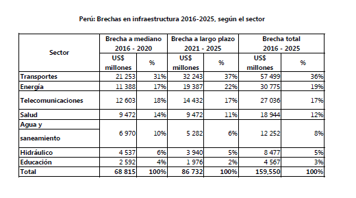 “A los países asiáticos les tomó como 25 años resolver su déficit de infraestructura y a nosotros nos tomaría el doble”, apuntó Rosas Romero durante su presentación en el X Congreso Anual sobre la Región Arequipa (CARA 2016). El sector que concentra la mayor brecha en infraestructura es el de transportes (36 %), seguido de energía (19 %), telecomunicaciones (17 %) y salud (12 %).