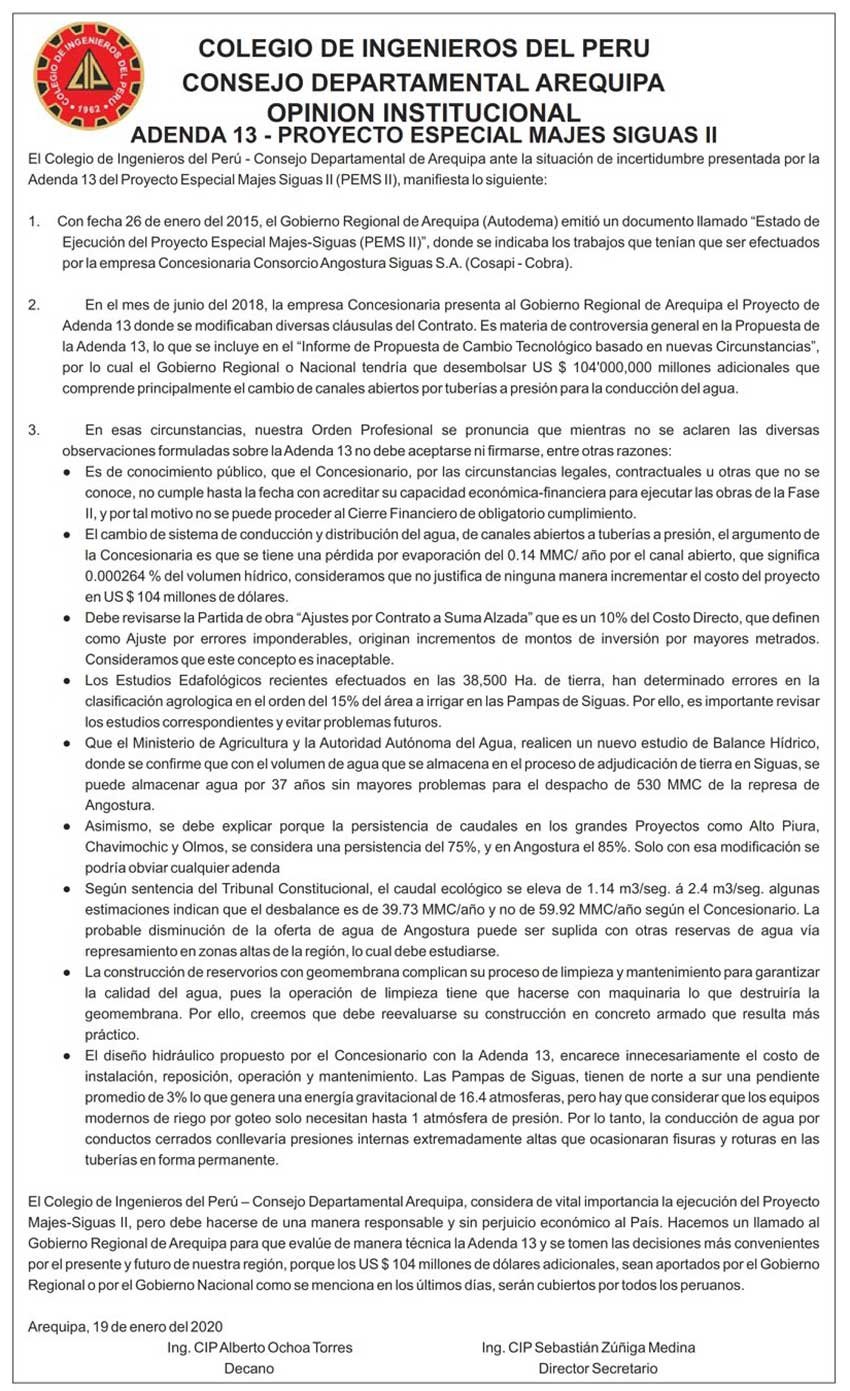 El Colegio de Ingenieros de Arequipa, a través de un pronunciamiento público, presentó un conjunto de observaciones técnicas a la Adenda 13 del proyecto Majes Siguas II.