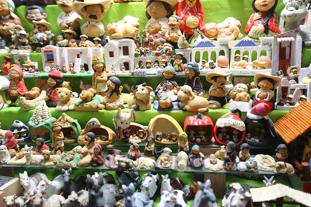 Entre los productos ofrecidos destacan los nacimientos arequipeños con imágenes que llevan la indumentaria típica del loncco: camisa blanca, sombreros de ala ancha y otras prendas que distinguen a esta postal mistiana. La versión arequipeña de José, María y Jesús, en algunos casos, se ambienta en los portales de la Plaza de Armas, el mirador de Yanahuara, o la Catedral. Si apuestan por una opción con fuerte identidad local esta es una alternativa.