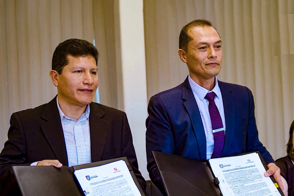 En la firma del convenio participaron el secretario general de la San Pablo, Héctor Cruz Mercado, y el superintendente de Relaciones Comunitarias de Cerro Verde, Keith Choquehuanca.