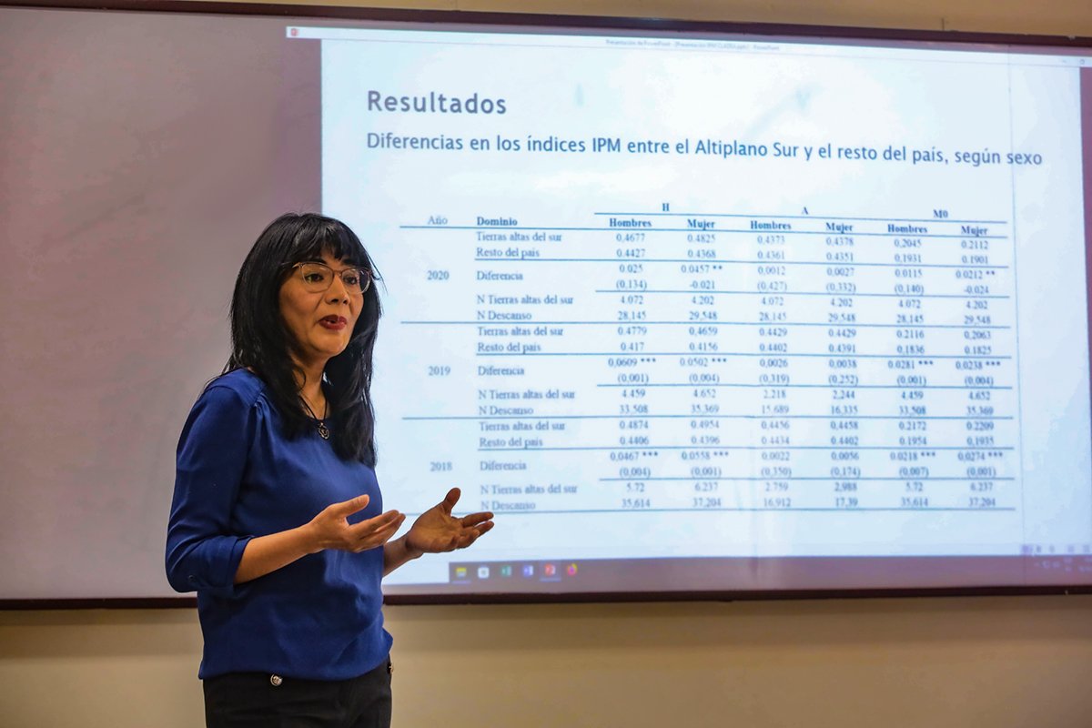 La docente de la San Pablo, Lieslie Gallegos expuso los resultados del estudio sobre pobreza multidimensional.