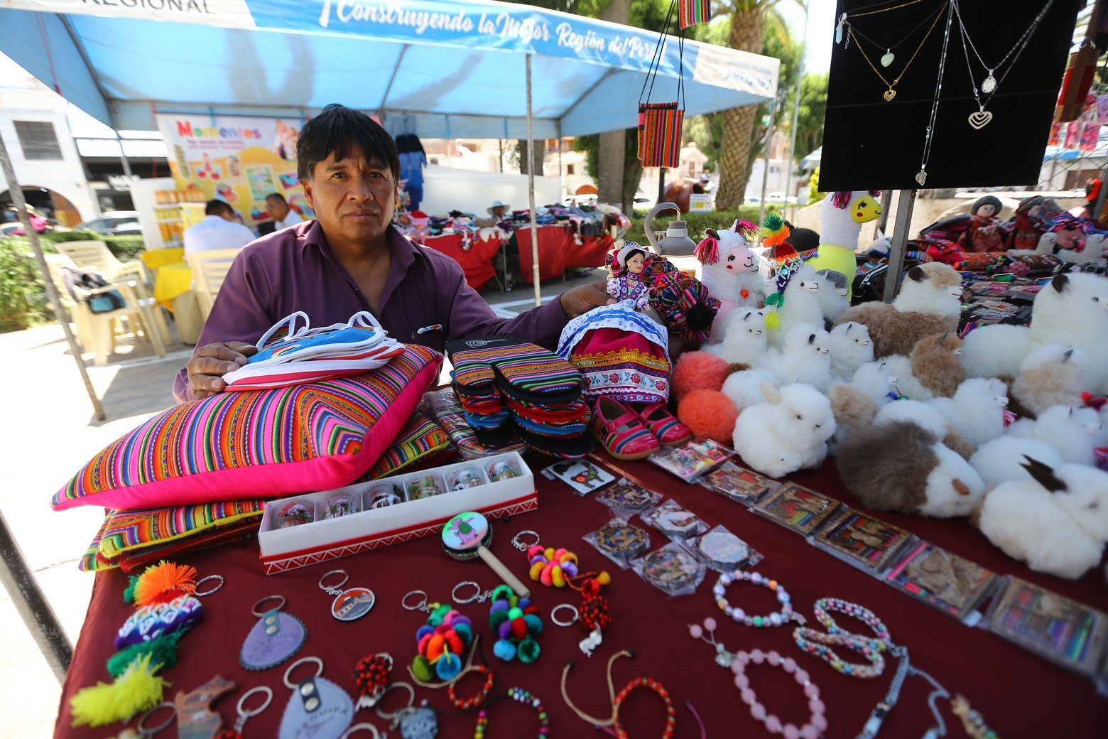 Frente a ella está Enrique Cari Huayta, de 50 años de edad. Su talento está en las confecciones. Ofreció peluches en forma de conejos y llamas. También cojines, llaveros con motivos arequipeños, pulseras, collares, etc. Tiene poliomielitis y debe utilizar un bastón para desplazarse.