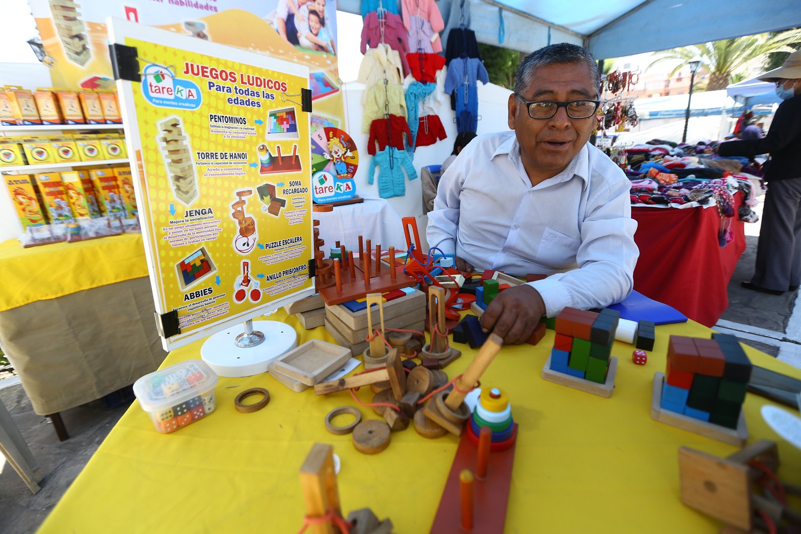 Su vecino de feria, Walter Mamani Ilaquita de 52 años de edad, conduce un negocio llamado “Tareka”, que consiste en elaborar juegos lúdicos dirigidos a escolares, pero también a adultos y ancianos en rehabilitación. La ventaja de estos juegos es que favorecen la concentración, coordinación, creatividad, etc.